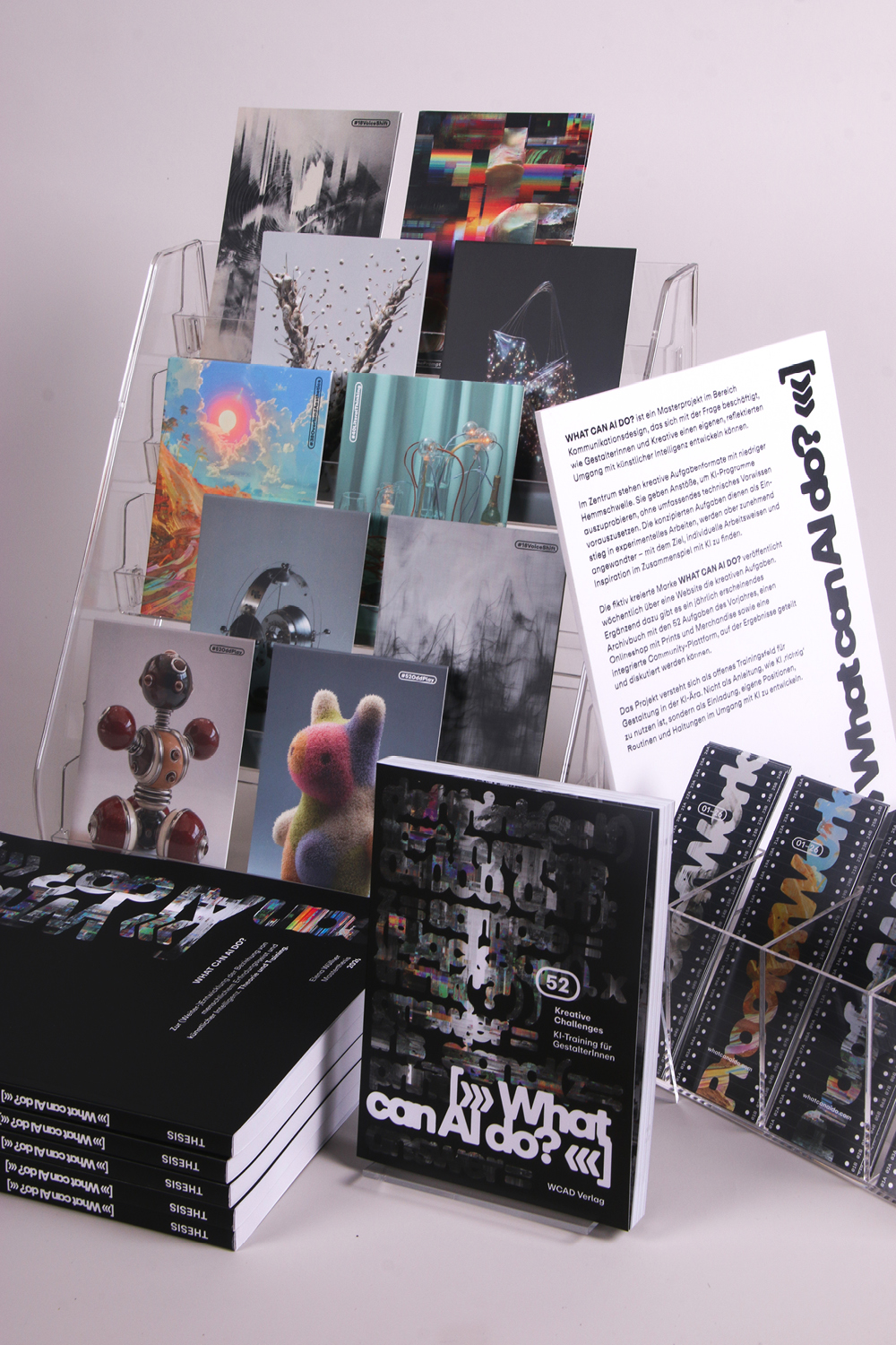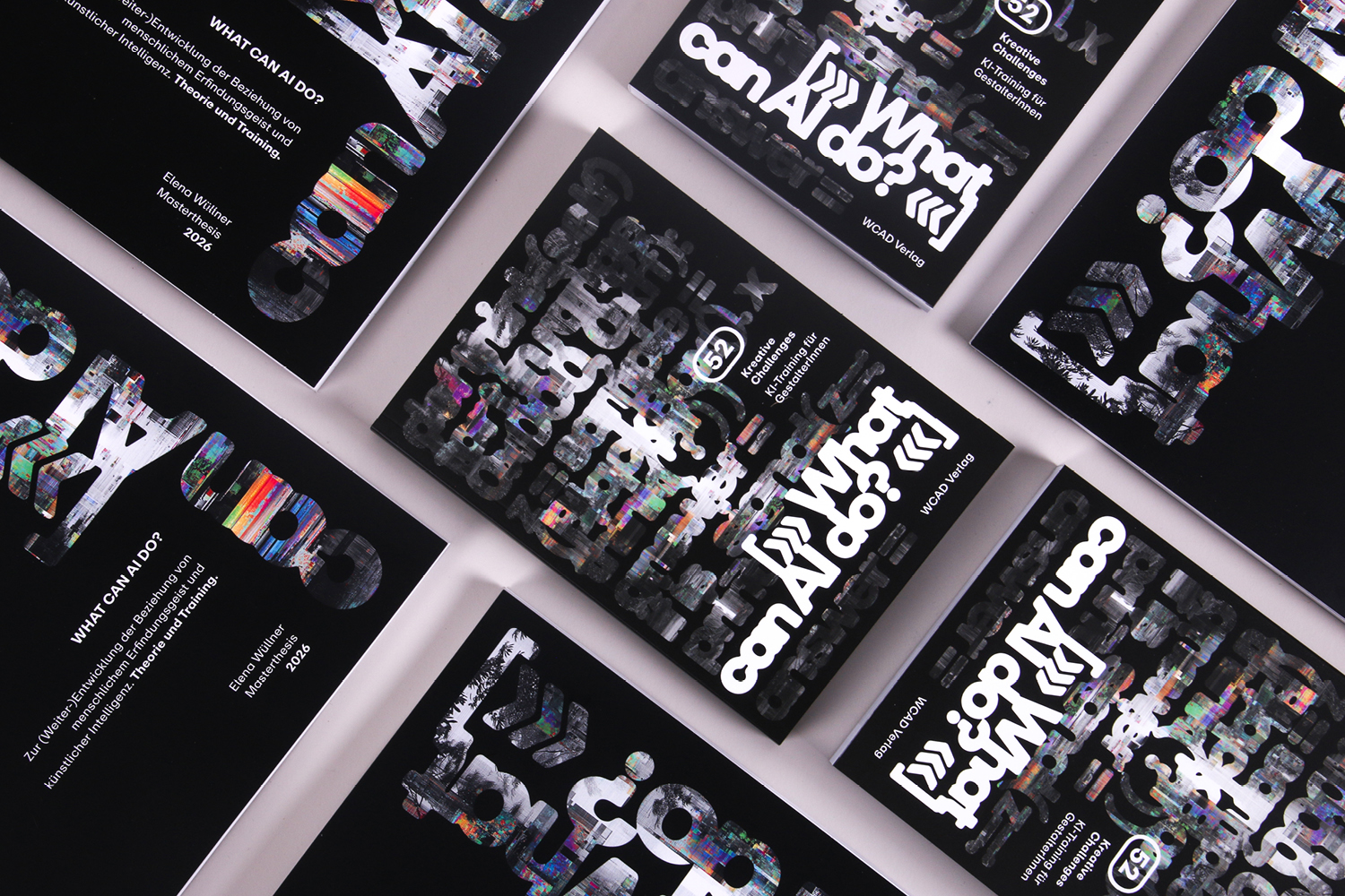 Die konzipierte Marke WHAT CAN AI DO? beschäftigt sich mit der Frage, wie Kreative einen reflektierten Umgang mit künstlicher Intelligenz entwickeln können. Im Zentrum stehen niedrigschwellige, kreative Aufgabenformate, die ohne technisches Vorwissen zum spielerischen Einstieg in die Arbeit mit KI einladen und sich bis hin zu angewandten Szenarien weiterentwickeln. Ziel ist es, individuelle Arbeitsweisen und Haltungen im Zusammenspiel mit KI zu fördern. Die Aufgaben erscheinen wöchentlich über eine Website und werden durch ein jährliches Archivbuch, einen Shop und eine Community-Plattform ergänzt.