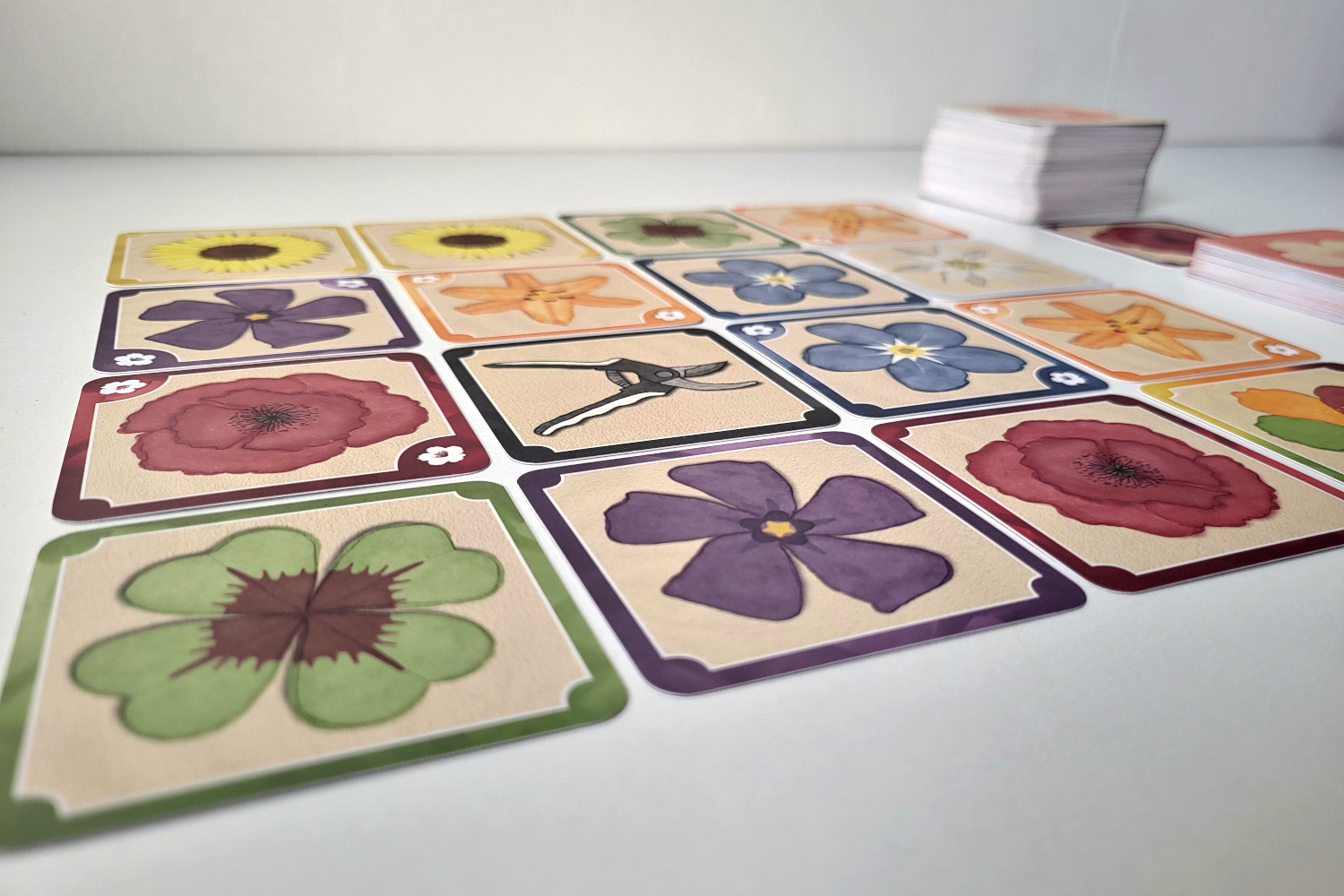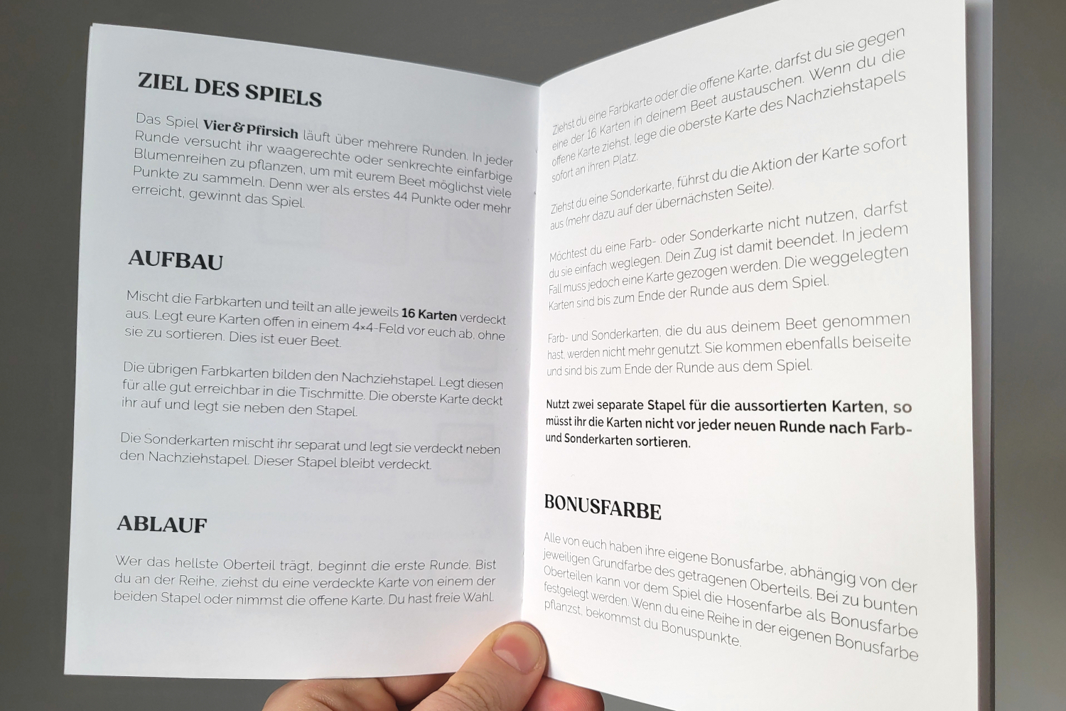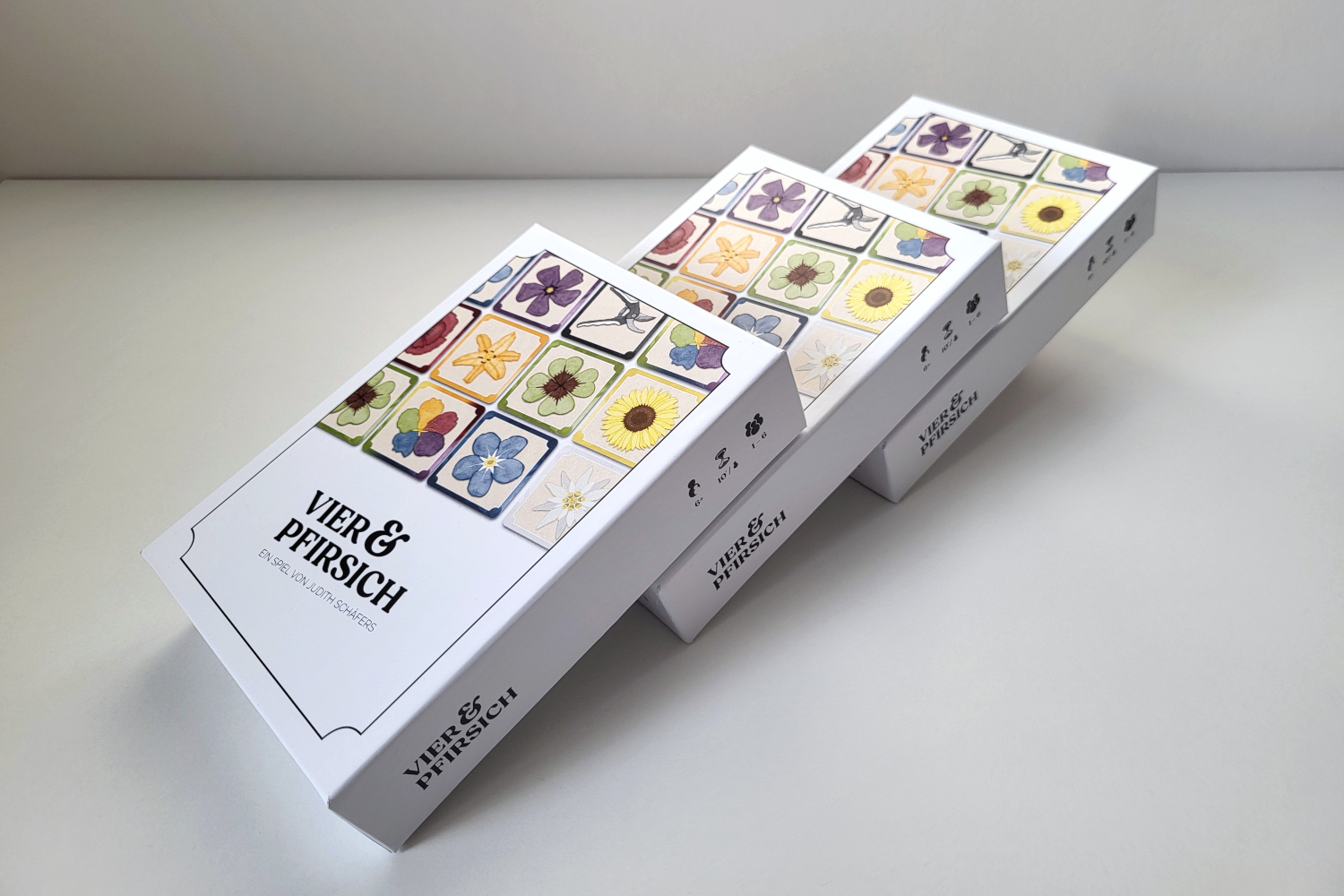 Das Spiel Vier&Pfirsich ist ein Kartenspiel über mehrere Runden. In jeder Runde wird versucht, waagerechte oder senkrechte einfarbige Blumenreihen zu pflanzen, um mit dem eigenen Beet möglichst viele Punkte zu sammeln. Denn wer als erstes 44 Punkte oder mehr erreicht, gewinnt das Spiel.