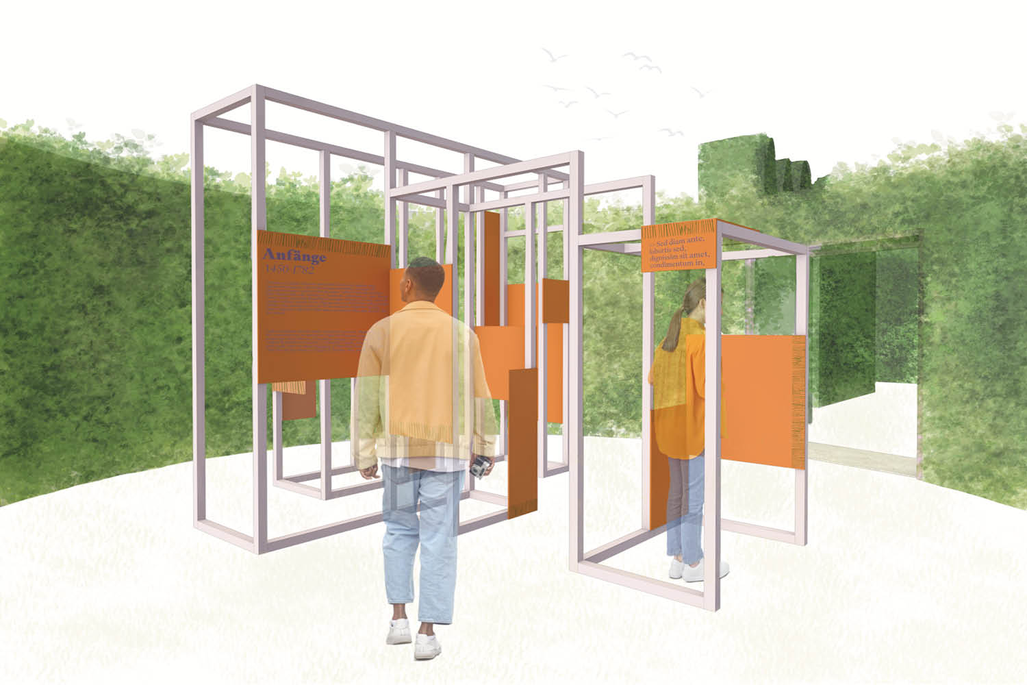 Die Ausstellung ist ein öffentliches Heckenlabyrinth, das sich mit der Entstehung, Verfestigung und Weiterführung des Hexennarrativs vom Mittelalter bis heute auseinandersetzt. Die Form des Labyrinths fungiert als räumliche Metapher für unseren derartigen Umgang. Verirrung, Projektion, Wiederholung und Ausschluss. In seiner Abfolge begegnet man Wegen, Sackgassen, Lichthöfen, Lichtungen und einem Garten in dem erfahrbar gemacht wird, wie sich Angst, Zuschreibung und Fiktion verdichtet haben und bis heute fortwirken. Die Raumtypen verhandeln faktische, emotionale und kulturelle Echos des Hexenbildes. Ein Hybrid aus Ausstellung und Gedenkort.