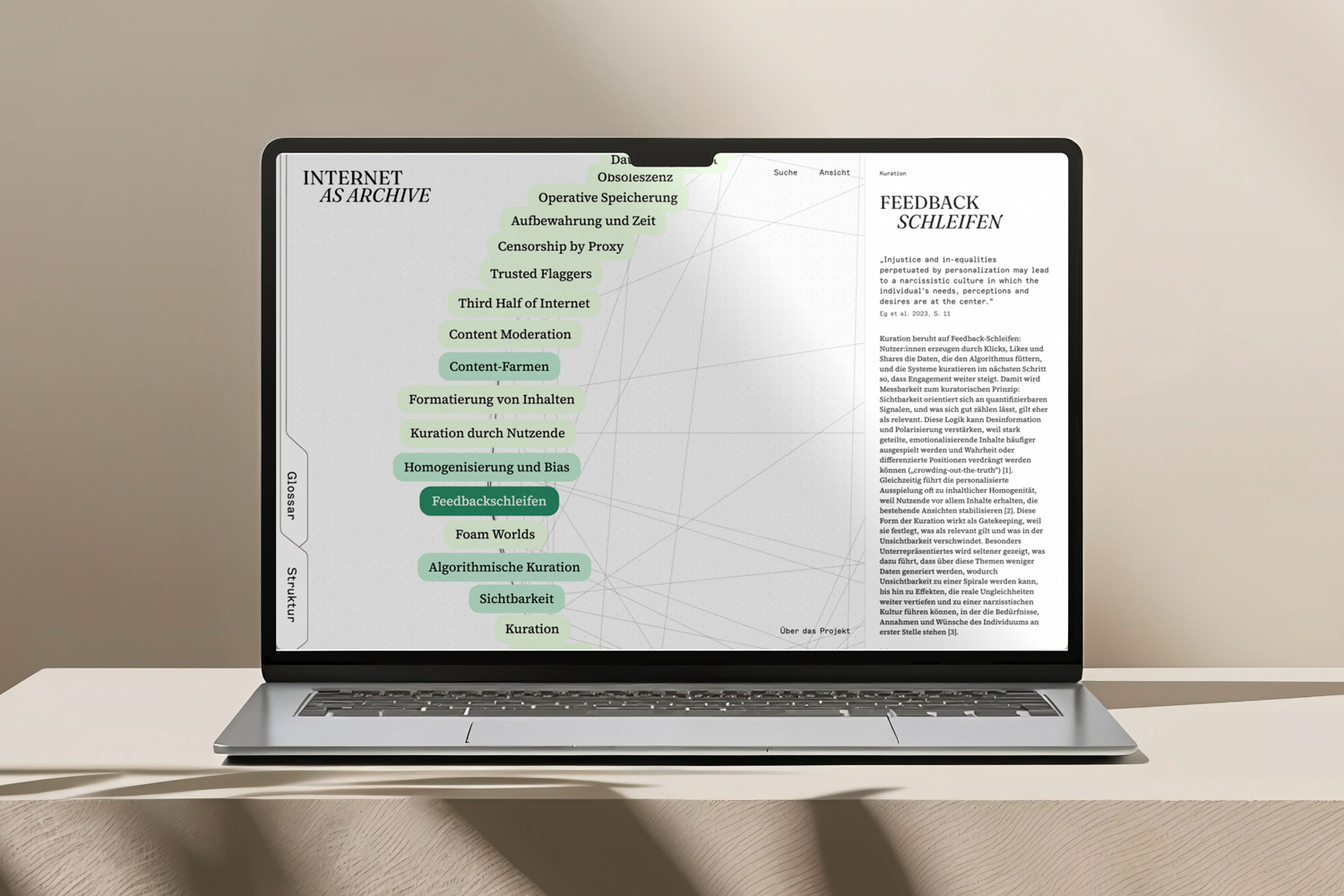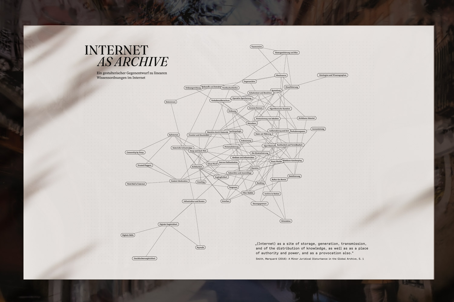 Viele Wissenszugänge im Internet laufen über Suchmaschinen, Feeds oder KI-Antworten und ordnen Inhalte als Liste oder Ergebnis. Dabei bleiben Auswahlregeln, Quellen und Beziehungen oft unsichtbar. Diese Arbeit versteht das Internet als Archiv: Auswahl, Ordnung, Zugang und Kuration strukturieren Sichtbarkeit und Macht. Als Gegenentwurf zu linearen Wissensordnungen entstand ein interaktives digitales Archiv, in dem ein dezentraler Netzwerkgraph Relationen sichtbar macht. Hier online verfügbar.