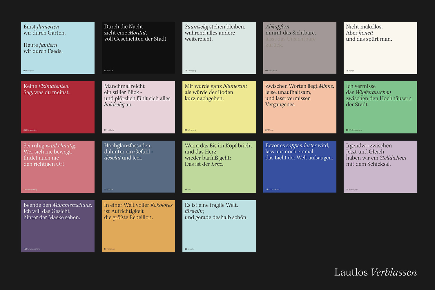 Manche Wörter verschwinden leise aus unserem Alltag. Sie werden seltener benutzt, geraten in Vergessenheit und bleiben vielleicht nur noch als Gefühl zurück. Lautlos verblassen beschäftigt sich mit genau diesen Worten. Das Projekt sammelt vergessene und aussterbende deutsche Begriffe und macht sie wieder sichtbar. Nicht aus Nostalgie, sondern aus dem Wunsch heraus, sich zu erinnern – und daran festzuhalten, wie Sprache unsere Wahrnehmung der Welt prägt.