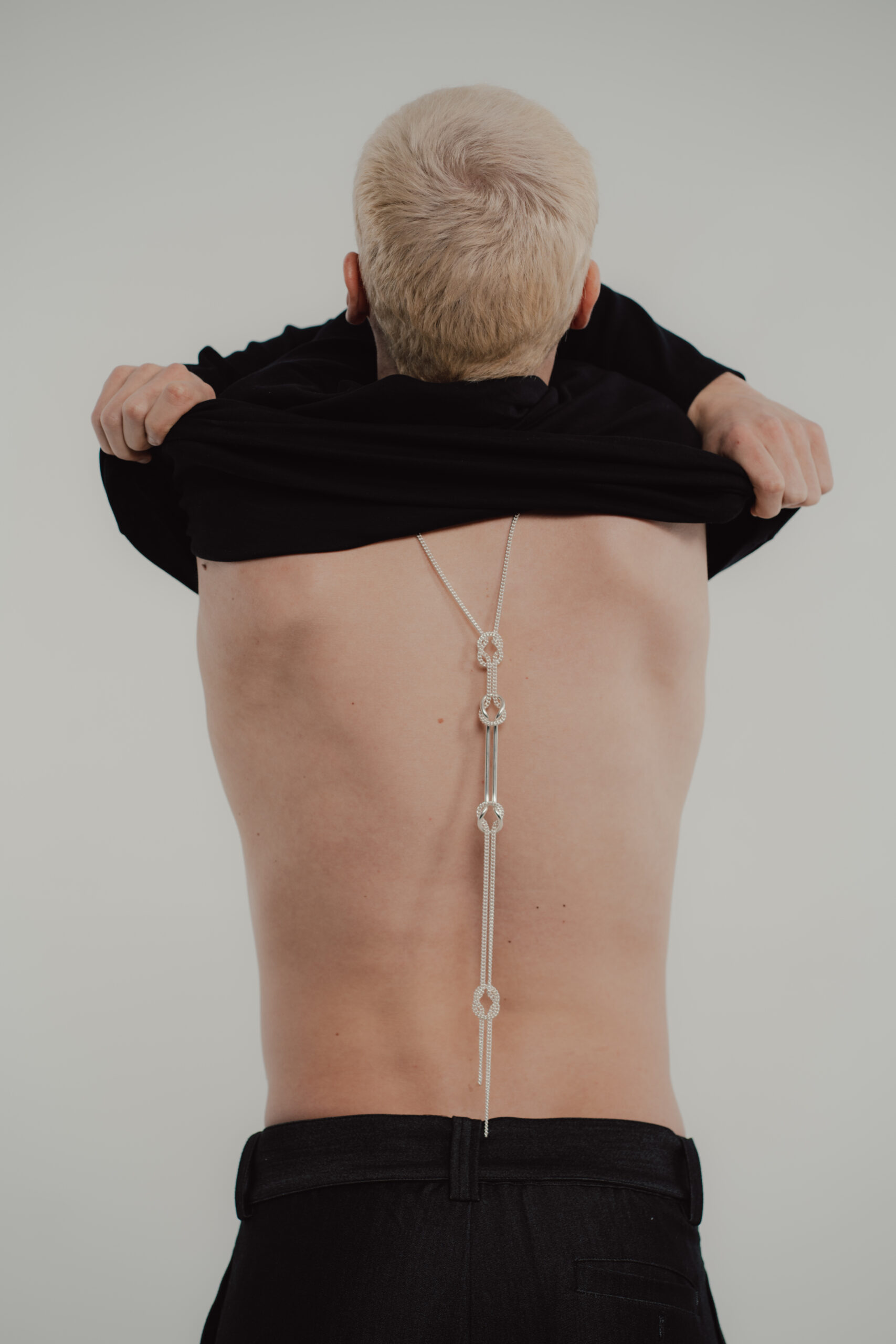 Diese Arbeit beschäftigt sich mit dem Knoten als kulturhistorisches, technisches und gestalterisches Phänomen. Die multidisziplinäre Methodik der Arbeit macht es möglich den Knoten nicht nur als technisches Hilfsmittel zu betrachten, sondern als universelles Strukturmodell, das funktionale, symbolische und soziale Dimensionen in sich vereint. Durch die Verbindung von Theorie, Experiment und Gestaltung entsteht ein transdisziplinärer Zugang, der den Knoten auf verschiedenen Ebenen als Prinzip erfahrbar macht. Es entsteht eine Schmuckkollektion und Wandhaken, jeweils inspiriert vom funktionalen und formalen Grundsatz des Kreuzknoten.
