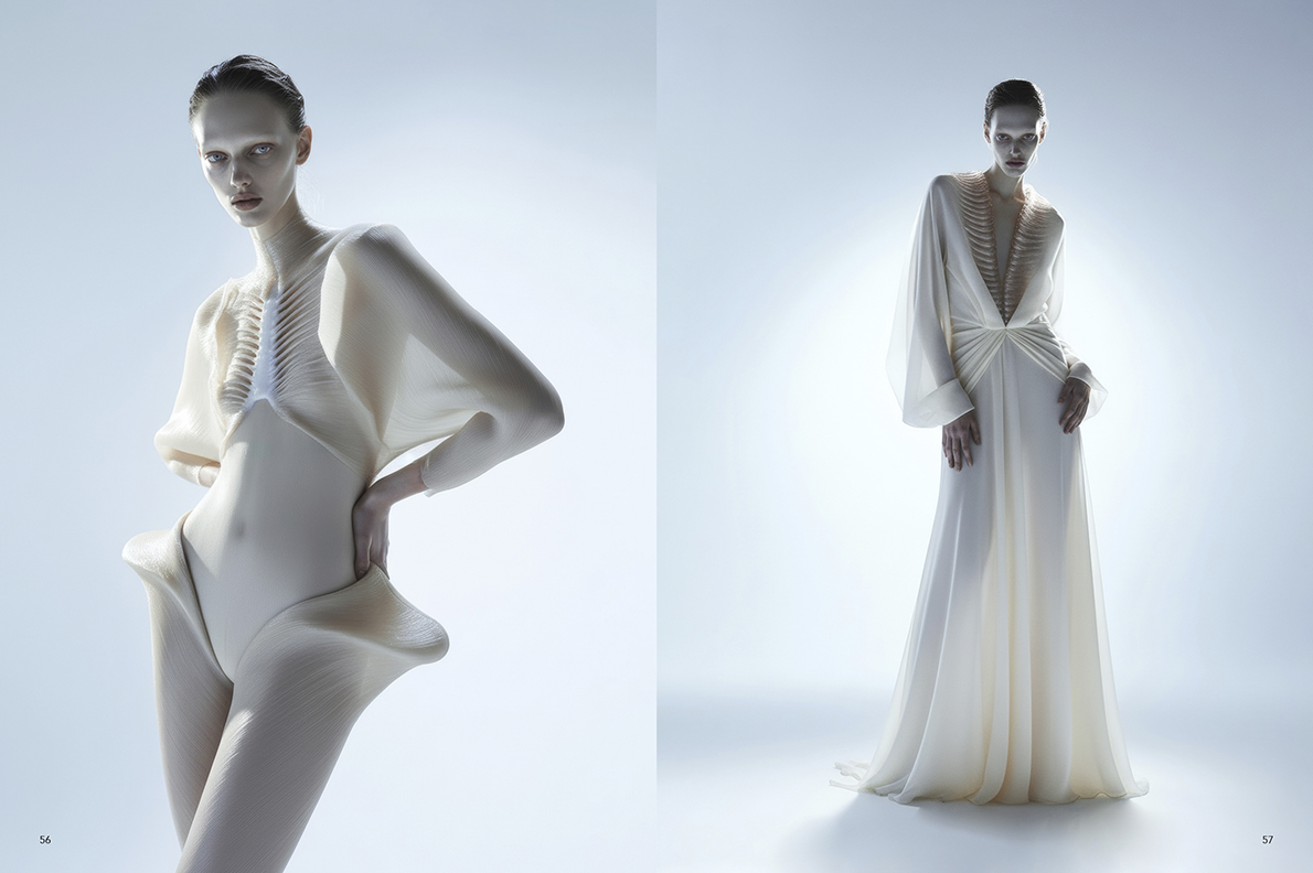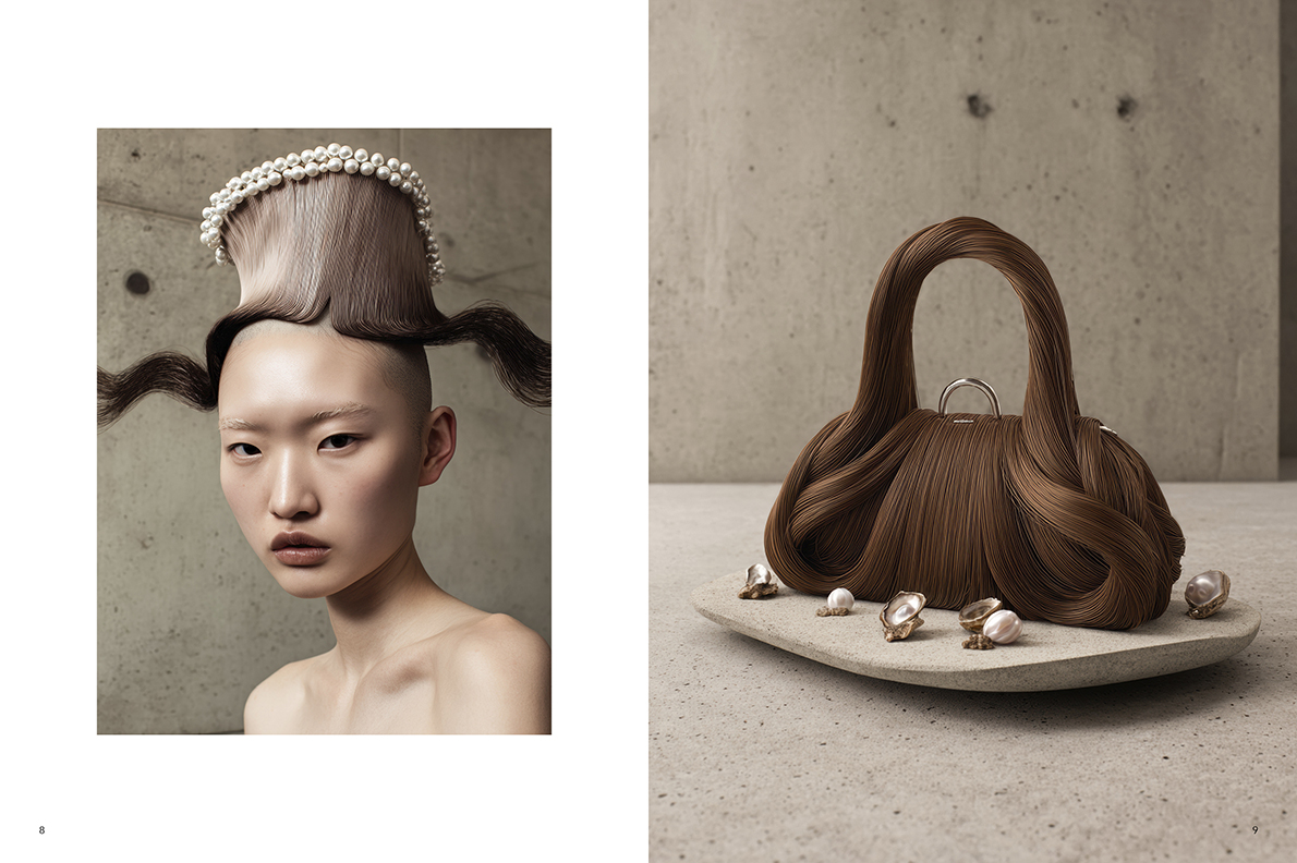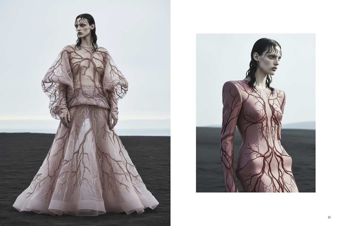 In der Masterarbeit „Autorschaft und Steuerung visueller Codes in der KI-basierten Modebildgestaltung“ untersuche ich, wie sich die Rolle des Gestalters verändert, wenn klassische Fotoproduktion durch einen KI-gesteuerten Prozess ersetzt wird. Anhand von Modebildern, die mit Hilfe von Midjourney entstehen, analysiere ich die Verschiebung von Entscheidung, Kontrolle und Verantwortung im gestalterischen Prozess. Das Ergebnis dieser Arbeit ist das Magazin „Körper-Codes“. Die 4 Editorial Strecken zu Haar, Gefäßsystem, Muskelstruktur und Knochen zeigen, dass Gestaltung im KI-basierten Prozess vor allem über Auswahl und Entscheidung funktioniert.